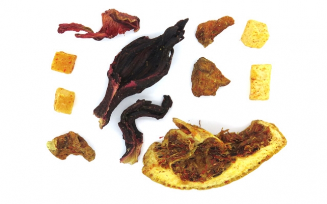 A vibrant, invigorating blend of dried tropical and other fruit such as papaya, mango, apple, pomegranate and orange, mixed with hibiscus blossoms to produce a bright-fuchsia-tinted brew that is easy on the tongue. The sweet-and-sour aromas prevail and are a perfect complement whether the tea is enjoyed hot or cold.