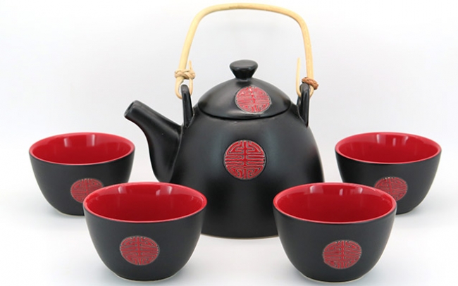 Five piece black and red ceramic Chinese tea set consisting of a pot with a bamboo handle and four cups, featuring a traditional oriental symbol.