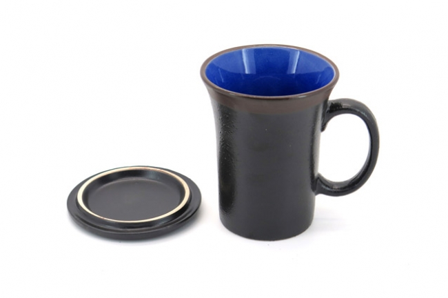 Ceramic tea mug with lid to maintain temperature level during brewing, made in Vietnam. Dark brown and rough on the outside, blue glaze on the inside.