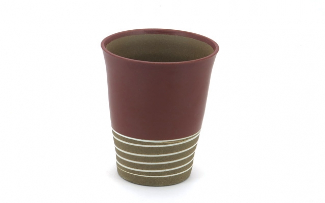 Brick brown tall Japanese ceramic cup featuring a white spiral on a brown background around the bottom and non-glazed interior.