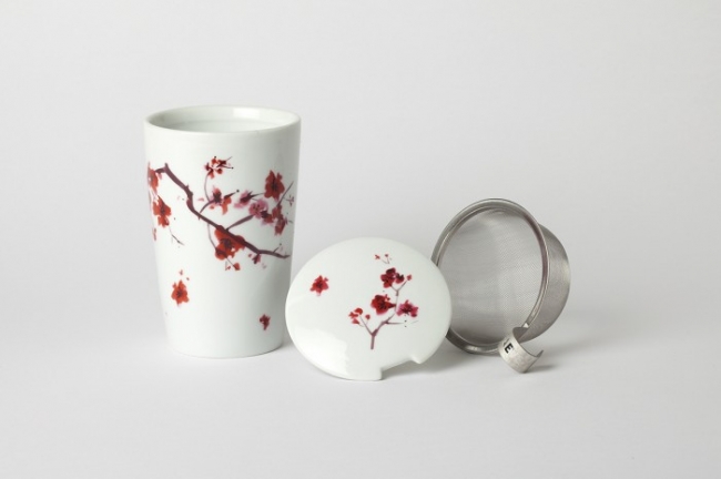 Large double-walled porcelain mug with stainless steel strainer and lid in a gift box, featuring cherry blossoms.