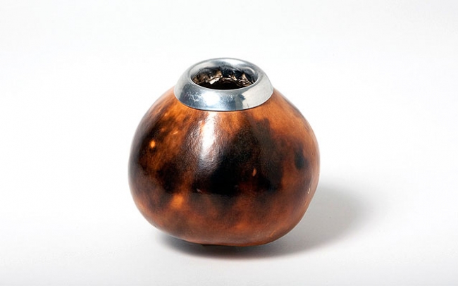 Poker work dark coloured natural mate gourd with a stainless steel metallic ring around the top. This is the traditional everyday recipient used in South America to drink mate.