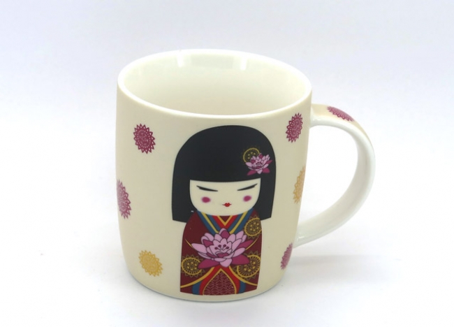 Off-white porcelain mug featuring two cute little blond geishas wearing black kimonos