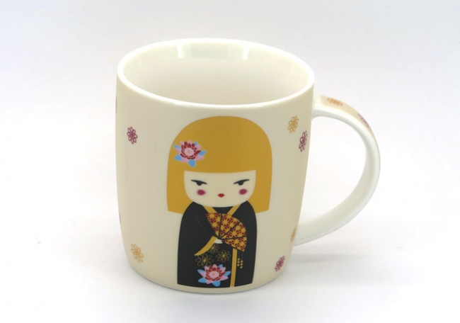 Off-white porcelain cup featuring two cute little black-haired geishas wearing a burgundy kimonos