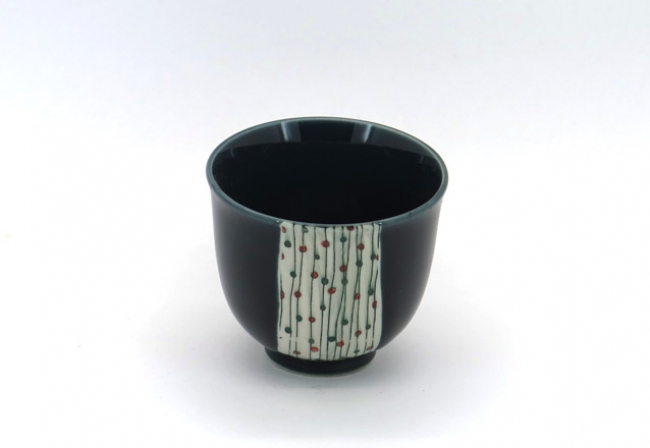 Fir green Japanese porcelain cup with a smooth finish featuring a white dotted vertical “paint brush” pattern.