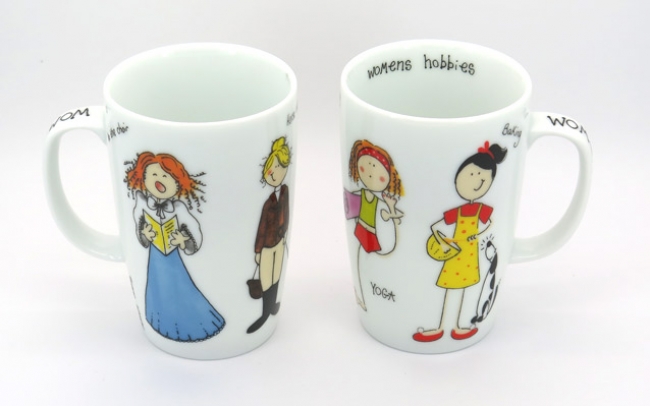 Tall white porcelain mug featuring various hobbies. One of 4 assorted such items.