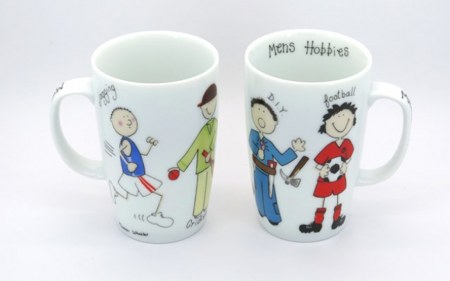 Tall white porcelain mug featuring various hobbies. One of 4 assorted such items.