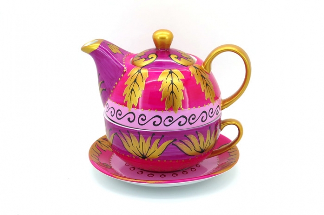 A porcelain Tea-for-one set consisting of a pot, cup and saucer featuring a pink and purple pattern, with gold decorations and handles.
